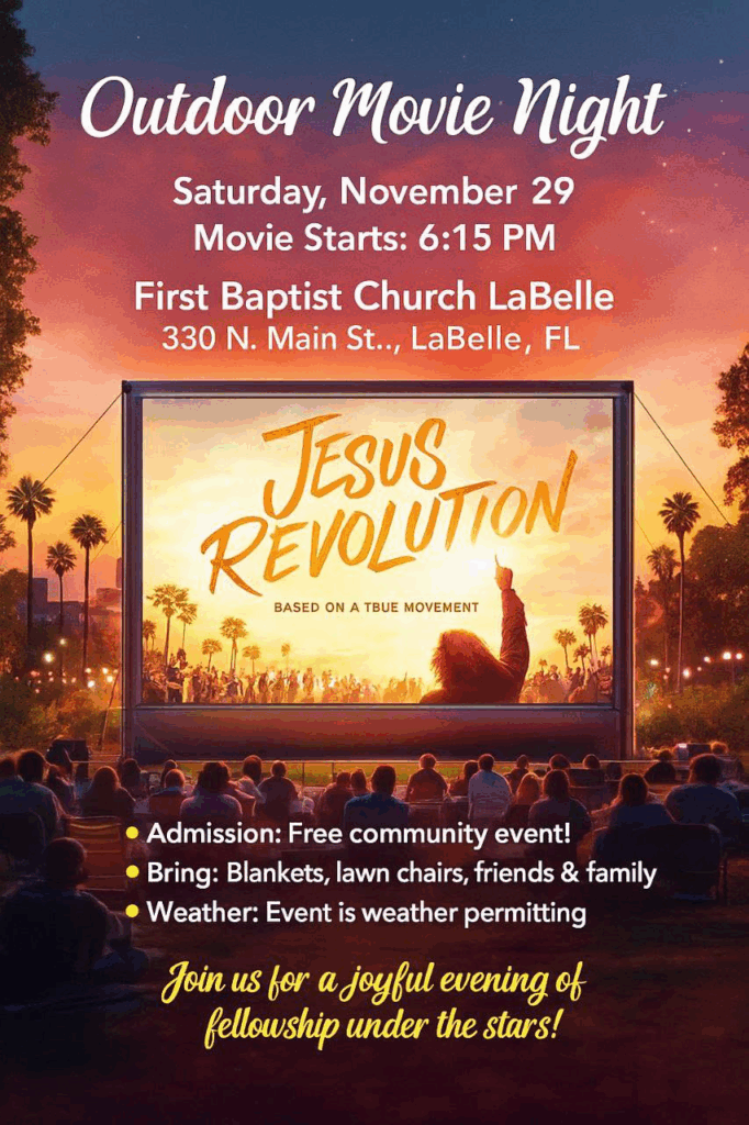 First Baptist Church of LaBelle is rolling out the big screen and inviting the entire community to a special Outdoor Movie Night on Friday, November 29th. The event, which offers a free night of entertainment, will feature the inspirational film, “Jesus Revolution.” This movie tells the true story of a national spiritual awakening in the early 1970s and its unexpected fusion with the counterculture movement of the time. The movie highlights the radical faith and love that brought together hippies and a traditional church, leading to what TIME Magazine dubbed a “Jesus Revolution.”